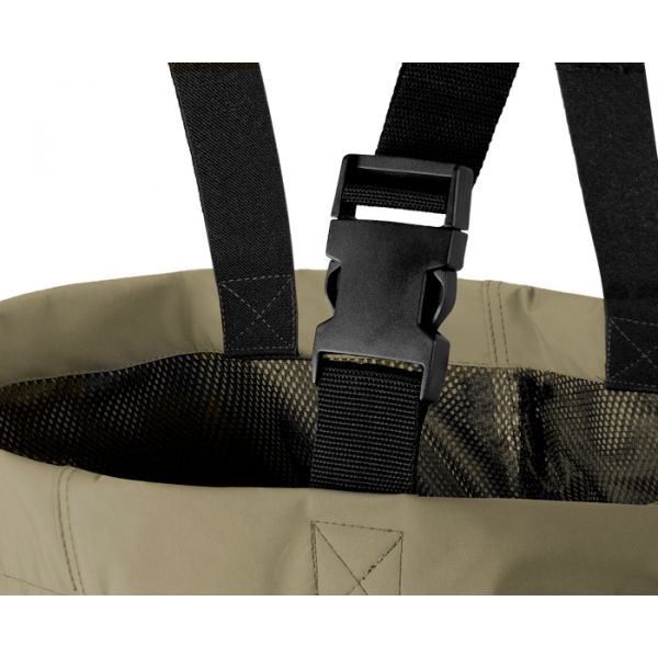 A HRON mellcsizma egy megbízható modell a Delphin márkától. Kiváló tulajdonságok és kiváló minőségű kivitelezés jellemzi. Minden részlet tökéletes pontossággal van elkészítve. A modern anyagnak köszönhetően teljesen vízhatlan és kényelmes a viselése az alacsony súlyának köszönhetően. A mellcsizma belsejébe egy hálós anyag van bele varrva, mely csökkenti a bőr érintkezését a vízálló anyaggal és így csökken az izzadás is. Hatalmas bónusz ebben a kategóriában a neoprén térd megerősítés, mely lehetővé teszi a kényelmes esetleges letérdepelést a víznél. A standard állítható vállpántokon kívül, ez a modell rendelkezik kivehető övvel is, hogy még jobban illeszkedjen a mellcsizma az alakjához. Az ellenálló és stabil talpal rendelkező gumicsizma segít a legkeményebb feltételeknél is. A sarok részen kiálló lehúzás segítő is természetesség. Összetétel: taslon/PVC