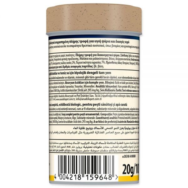 A-vitamin 37600 IU/ kg, D3-vitamin 2000 IU/ kg, E-vitamin 125 mg / kg, B1-vitamin 45 mg / kg, vitamín B2 125 mg / kg, B3-vitamin 25 mg / kg, B12-vitamin 0,1 mg / kg, L-aszkorbil-2-polifoszfát (stabilizált C-vitamin) 515 mg / kg, kalciu-pantotenát 125 mg / kg. További változatokban gyártják Tetra Min, Tetra Min mini és Tetra Min nagy pehely.