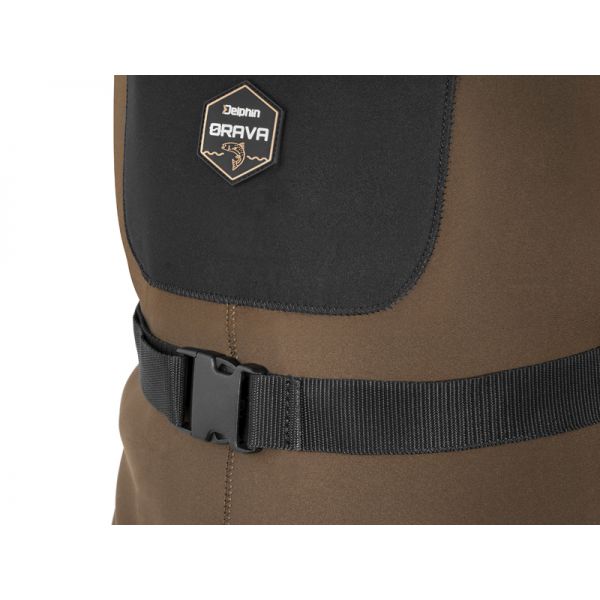 A téli horgászatok során a meleg ruházatra különös figyelmet kell fordítani. A Delphin ORAVA neoprén gázlócsizma gondoskodik erről. Elegáns dizájn és csúcsminőségű gyártási technológia jellemzi, amely során minden öltés és varrás precízen készül a vízszivárgás megelőzése érdekében. Barna színének köszönhetően a halnyálka és egyéb foltok nem lesznek annyira láthatóak a felületén. Az elülső klasszikus neoprén zsebben apró dolgok tárolhatók, mint például a horgászengedélyünk. Nem kell félni a letérdeléstől sem, hiszen a térdrészeken a csizma dupla neoprén réteggel van megerősítve. Az állítható vállpántok neoprén béléssel vannak ellátva a nagyobb kényelem érdekében az egésznapos horgászat során. A vállpántok alatt két műanyag gyűrű található, amelyeken különféle kiegészítők, például mérőszalag vagy csipesz tárolható rugalmas szalagokon. A csomag tartalmaz egy gázlóövet is, amely megakadályozza, hogy a víz bejusson a csizmába, ha megcsúszna vagy elesne. A csizmarész tartós és stabil talppal rendelkezik, amely képes ellenállni a legkeményebb körülményeknek is. Neoprén talpbetéttel vannak bélelve, hogy jobban védje lábunkat a hidegtől.