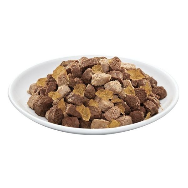 HÚSSAL: hús és állati melléktermékek (4% marhahús), gabonafélék, növényi fehérjekoncentrátumok, ásványi anyagok, cukrok. Színezék és tartósítószer nélkül.