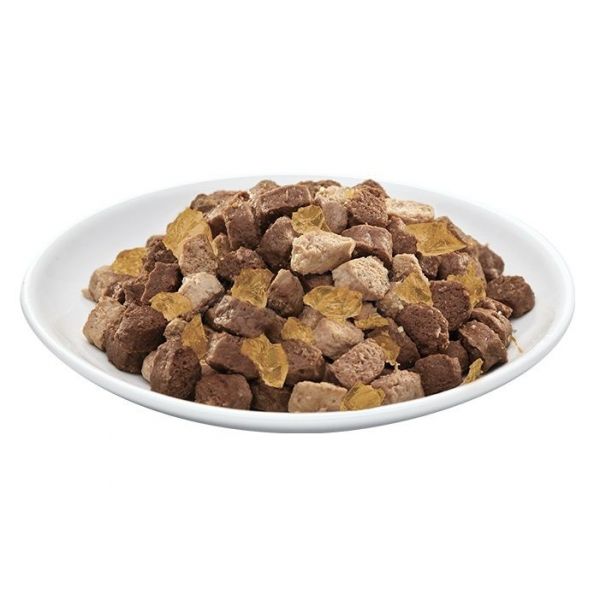 Csirkével: hús és állati melléktermékek (4% csirke), gabonafélék, növényi fehérje koncentrátumok, ásványi anyagok, cukrok. Színezékek és tartósítószerek nélkül.
