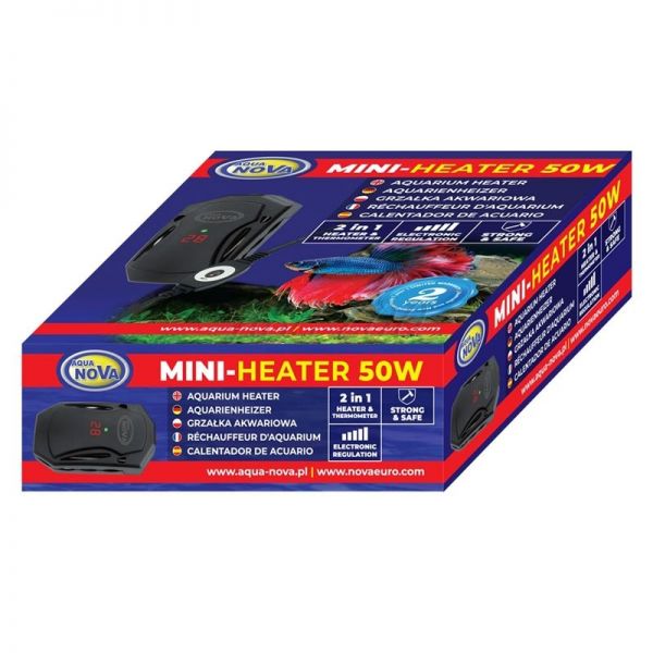 Aqua Nova MINI-HEATER 50W ideális megoldás azoknak az akvaristáknak, akik megbízható és biztonságos fűtőberendezést keresnek akváriumaik és terráriumaik számára, pontos hőmérséklet-szabályozással.