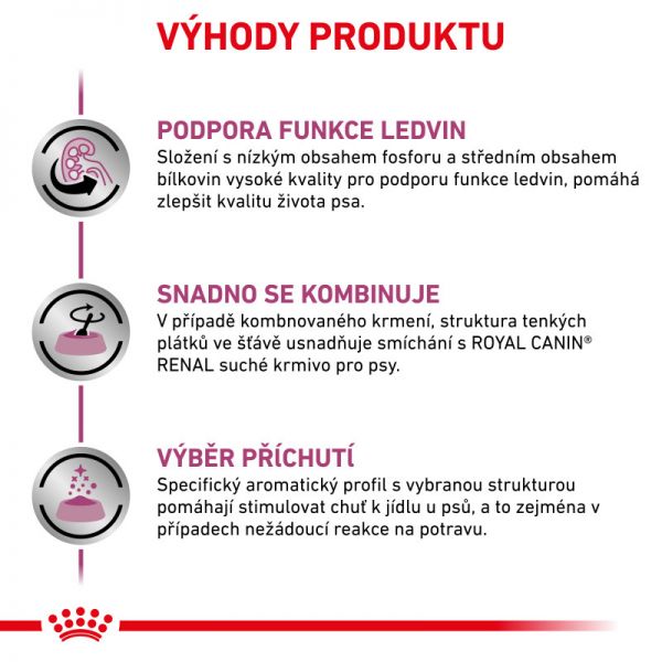 ROYAL CANIN® RENAL, vékony szeletekben, mártásban, teljes értékű diétás eledel kutyák számára, amely alacsonyabb foszfortartalmának, valamint kiváló minőségű fehérjéinek köszönhetően támogatja a veseműködést krónikus veseelégtelenség esetén.AJÁNLÁS: Javasoljuk, hogy az adagolás megkezdése vagy meghosszabbítása előtt konzultáljon állatorvosával.krónikus veseelégtelenség esetén a RENAL-t az első fázisban 6 hónapon keresztül adjukA Dog Renal termékcsaládot vesebeteg kutyáknak szánjuk.