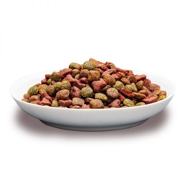 összetétel: Gabonafélék, hús és állati eredetű termékek (17 %; ebből 4 % csirke a zöld, narancssárga és barna pelletben), növényi fehérjekivonatok, olajok és zsírok, élesztő (2,5 %), növényi eredetű melléktermékek (2 % céklapép), ásványi anyagok, zöldségek (1 % szárított borsó, ami 4 % borsónak felel meg a zöld, narancssárga és barna pelletben).