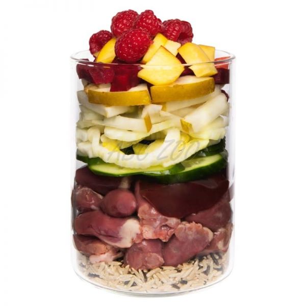 Kompozíció: Kacsaszív (42%), kacsamáj (11%), körte (7%), őszibarack, édeskömény, uborka, natúr rizs (7%), cékla* (7%), málna (1,5%), repceolaj, osztriga*, őrölt szezámmag* (0,4%), sörélesztő*, kömény*, ásványi kömény*, szerecsendió só*, majoránna* tengeri moszat*.