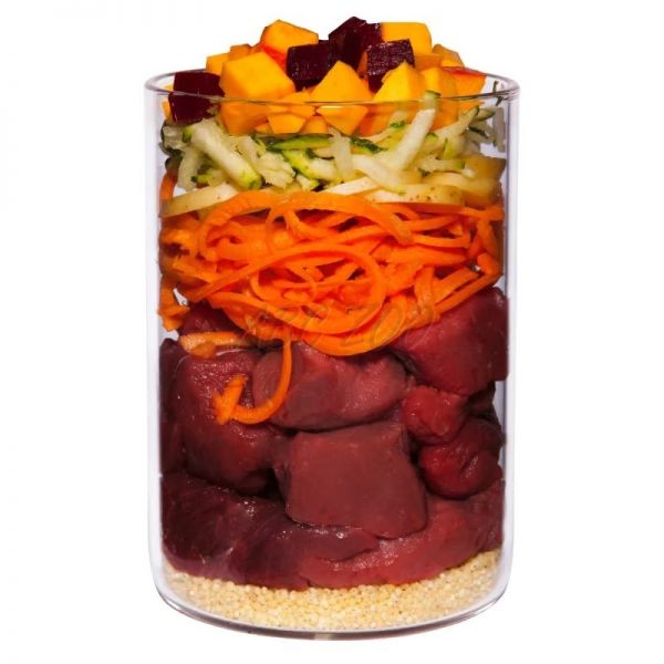 összetevők: Vadhús (47%), burgonya, sárgarépa, sütőtök (8%), cukkini, zeller, zsírszegény joghurt, cékla*, amarant (3%), repceolaj, osztriga*, sörélesztő*, áfonya* (0,6%), bazsalikom*, ásványi agyag*, virágpor*, tengeri moszat*, ásványi anyagok