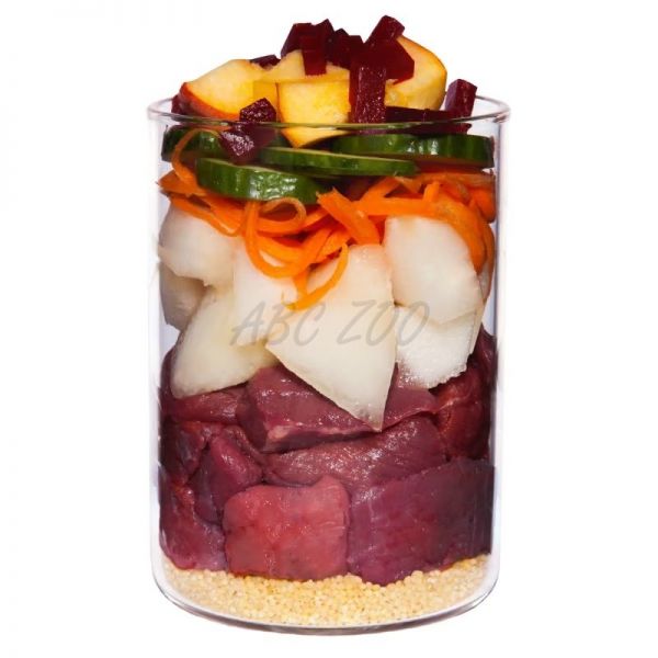 Kompozíció: Borjú szívizom hús (41%), borjú tüdő (15%), sárgarépa, köles (8%), sárgadinnye (6%), zeller, uborka (5%), cékla* (4%), sárgabarack (3%), repceolaj, osztriga*, sörélesztő*, bazsalikom*, vízitorma*, homoktövis*, andoki só, édesköménymag*, ásványi agyag*, csipkebogyó*, tengeri moszat*, ásványi anyagok