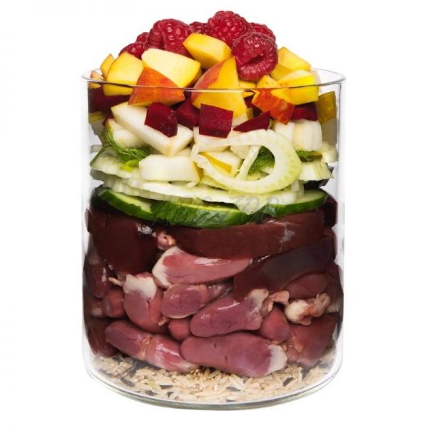 Kompozíció: Kacsaszív (42%), kacsamáj (11%), körte (7%), őszibarack, édeskömény, uborka, natúr rizs (7%), cékla* (7%), málna (1,5%), repceolaj, osztriga*, őrölt szezámmag* (0,4%), sörélesztő*, kömény*, ásványi kömény*, szerecsendió só*, majoránna* tengeri moszat*.