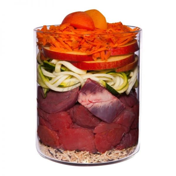Kompozíció: Szívizom marhahús (30%), cukkini, sárgarépa (12%), marhatüdő (11%), alma (9%), marhamáj (7%), rizs natúr (6%), marhahús izom (4,5%), sárgabarack, repceolaj, osztriga*, sörélesztő*, bazsalikom*, édesköménymag, petrezselyem*, csipkebogyópor*, ásványi agyag* tengeri moszat*, ásványi anyagok