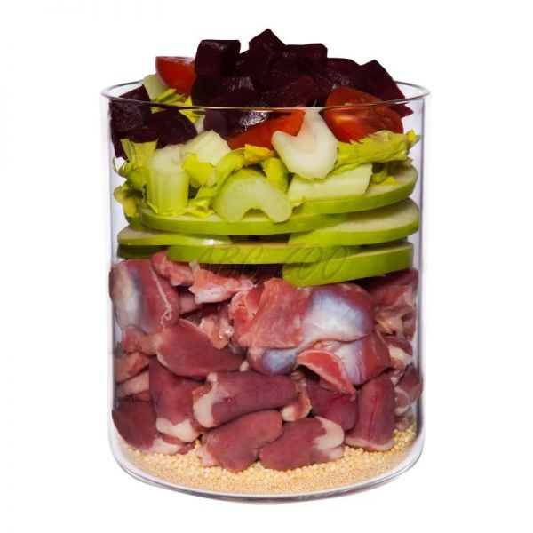 Kompozíció: Csirkeszív (24%), paradicsom (17%), csirkegyomor (16%), csirkemáj (11%), körte, amarant (5%), csirkehús (4%), köles, cékla*, zellerszár, kókuszliszt, repceolaj, osztriga*, sörélesztő*, bazsalikom* (0,4%), ásványi agyag*, andoki só, csipkebogyó*, tengeri moszat*, ásványi anyagok