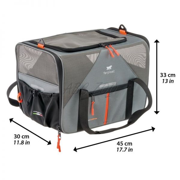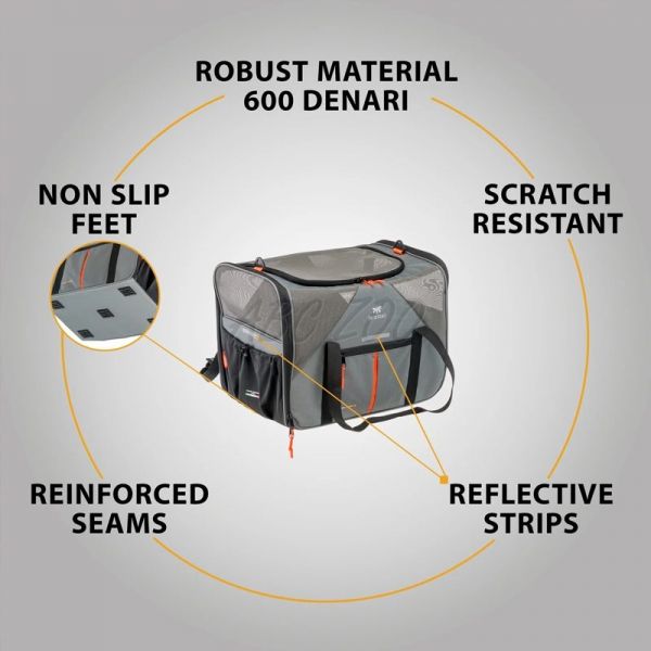 Ez a hordozó tartós 600 denier poliészterből készült, PU bevonattal, amely karc- és vízállóságot biztosít. A két oldalán található, erős cipzárral ellátott széles nyílások könnyű hozzáférést biztosítanak kedvence számára, míg a tetején található, összecsukható biztonsági háló javítja a szellőzést és a kényelmet. Az ergonomikus fogantyú és az állítható, párnázott vállpánt kényelmes viseletet biztosít, míg a fényvisszaverő elemek növelik a láthatóságot az éjszakai utazás során.