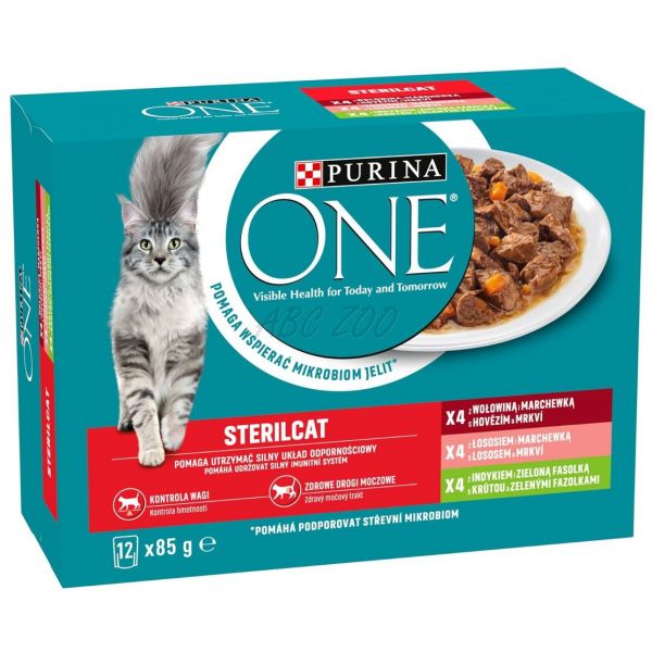 PURINA ONE STERILCAT tasakok - gyűjtőcsomagolás marhahússal, lazaccal és sárgarépával, pulyka és zöldbab ízletes lében.