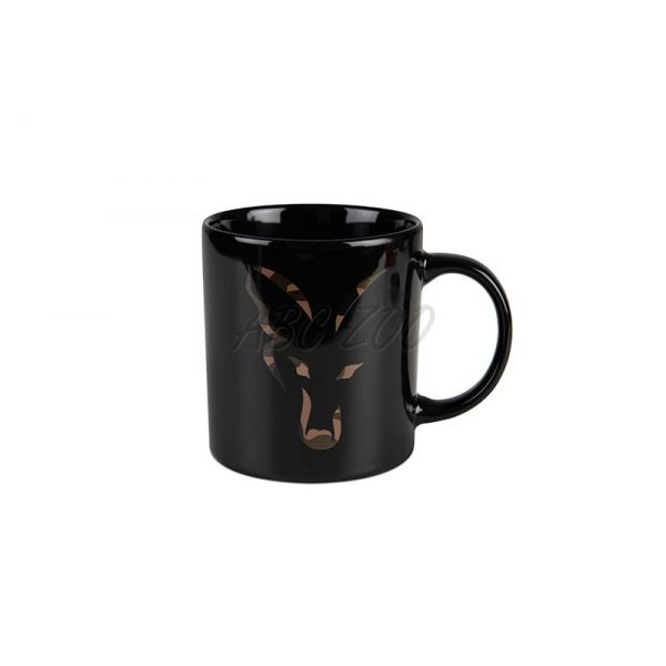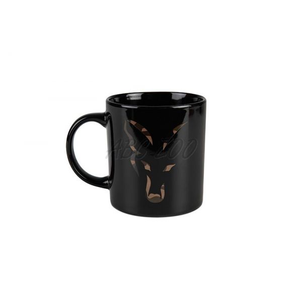 Fekete bögre álcázott Fox logóval, ideális nemcsak forró italokhoz a vízparton.