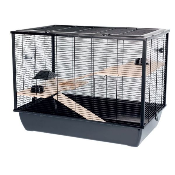 Rágcsálóketrec fából készült kiegészítőkkel. Fekete színű tálca és keret. Bővebb leírás