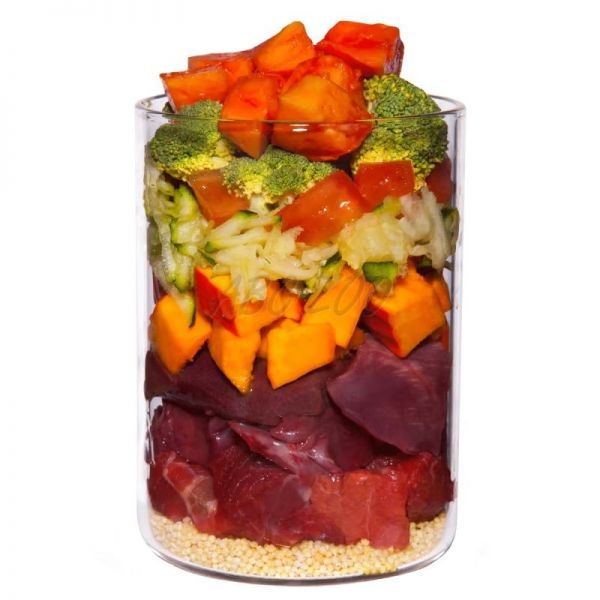 Arány Hús : köles : zöldségek/gyümölcsök/növények : egyéb nyersanyagok = 55% : 7% : 34% : 4%