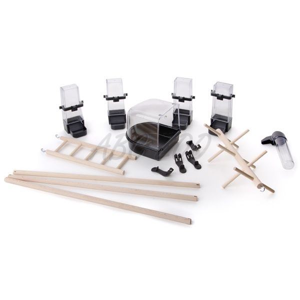 3× fa ülőrúd 1× fa létra 1× fa játék 4× műanyag etető 1× műanyag itató 1× madárfürdető 2× kihúzható műanyag tisztítótálca