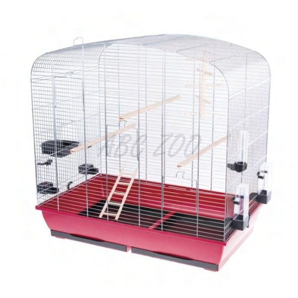 Nagy ketrec kis és közepes méretű madarak számára, gazdag felszereltséggel. Krómozott ráccsal. Piros színű tálca. Bővebb leírás