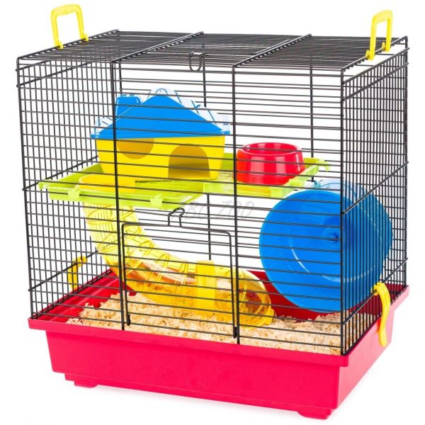 A ketrec hörcsögök számára alkalmas, amely emeletet, alagútat, tálat, házikót és futókereket tartalmaz. Piros színű tálca. Bővebb leírás