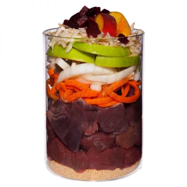 összetevők: Lóizom (51%), sárgarépa, zeller, amaránt (9%), édeskömény, alma, őszibarack (5%), cékla* (3%), repceolaj, sörélesztő*, osztriga*, kakukkfű*, homoktövis*, Andok sója, ásványi agyag*, tengeri moszat*, ásványi anyagok
