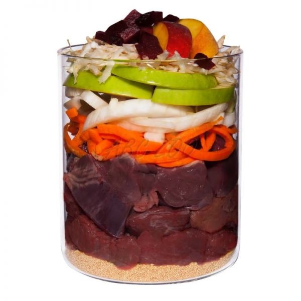 összetevők: Lóizom (51%), sárgarépa, zeller, amaránt (9%), édeskömény, alma, őszibarack (5%), cékla* (3%), repceolaj, sörélesztő*, osztriga*, kakukkfű*, homoktövis*, Andok sója, ásványi agyag*, tengeri moszat*, ásványi anyagok