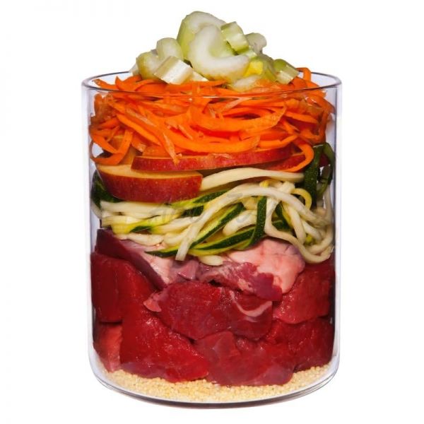 arány Hús : zöldség/gyümölcs/növény : köles : egyéb nyersanyagok = 46 % : 44 % : 8 % : 2 %