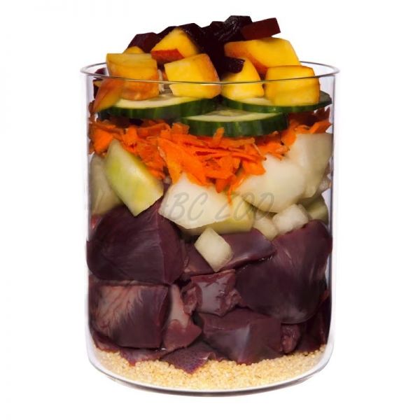 Kompozíció: Borjú szívizom hús (41%), borjú tüdő (15%), sárgarépa, köles (8%), sárgadinnye (6%), zeller, uborka (5%), cékla* (4%), sárgabarack (3%), repceolaj, osztriga*, sörélesztő*, bazsalikom*, vízitorma*, homoktövis*, andoki só, édesköménymag*, ásványi agyag*, csipkebogyó*, tengeri moszat*, ásványi anyagok
