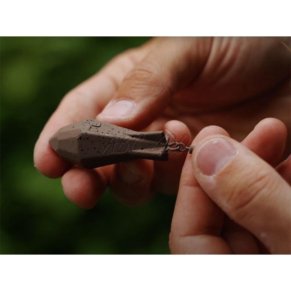 A súly felülete természetes barna árnyalatú, fekete pöttyökkel, ami tökéletesen álcázza a fenéken. A csigolyán található megnagyobbított fűzőlyuk lehetővé teszi a gyors és egyszerű rögzítést a szerelékhez.