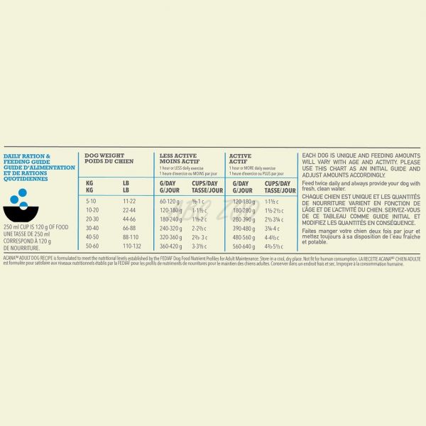 Az Acana Adult termék friss, helyi hozzávalókból készül, szabadon tartott csirkéből, mélyalmos tojásból, vadon élő lepényhalból és napérlelte gyümölcsökből és zöldségekből, megőrizve értékes tápanyagaikat és ízletességüket, biztosítva a kistestű kutyusok jó kondícióját.