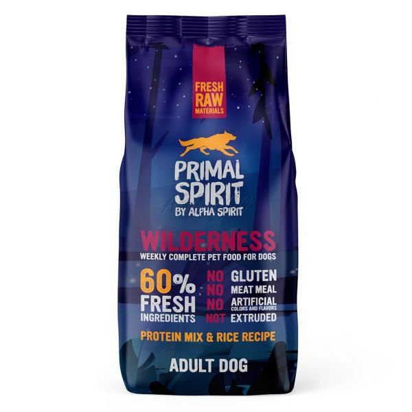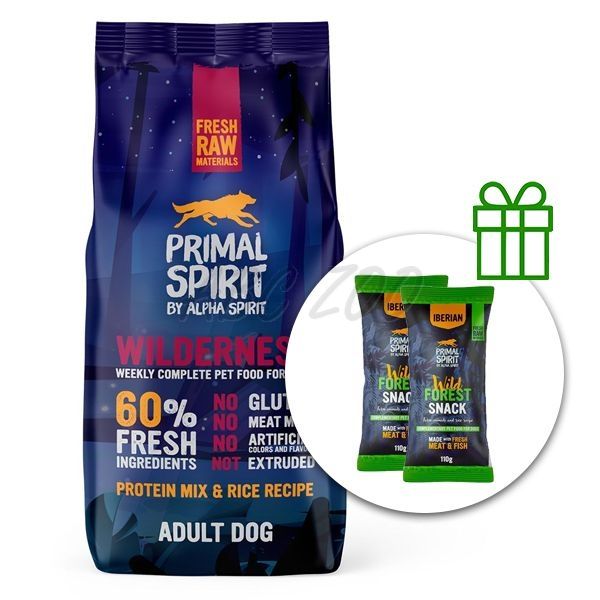 Primal Spirit Dog 60% Wilderness Dog Ibériai malac 12 kg + 2 x jutalomfalat GRÁTISZ