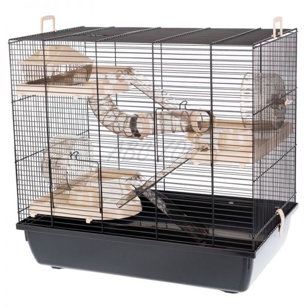 Kis rágcsálók, mint az egér vagy a hörcsög számára készült ketrec műanyag kiegészítőkkel és alagúttal. A tálca fekete színű. Bővebb leírás