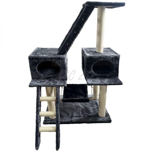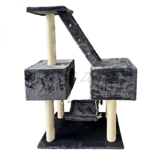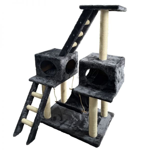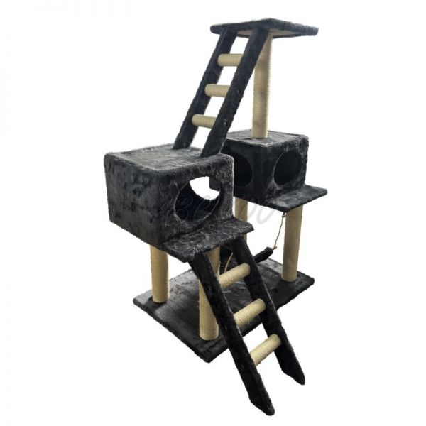 Ez a robusztus kaparófa két tágas búvóhelyet, kényelmes függőágyat és két létrás platformot kínál, amelyek változatos lehetőséget nyújtanak macskájának a játékra és pihenésre. A sisal oszlopok támogatják a természetes kaparási ösztönt, miközben megóvják bútorait a karcolásoktól. Stabil felépítése és puha felülete ideális helyet biztosít mindennapi pihenéshez és kalandos játékokhoz minden korú macska számára.
