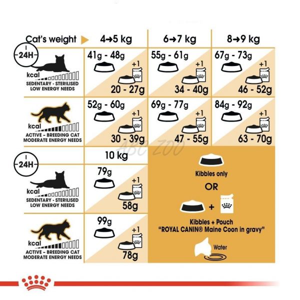 A macskák egyedi preferenciáinak kielégítése érdekében a ROYAL CANIN Maine Coon Adult nedves táp formájában is elérhető, ízletes szószban. Ha kombinált etetést fontolgat, egyszerűen kövesse adagolási táblázatunkat, hogy biztosítsa, hogy macskája a megfelelő mennyiségű nedves és száraz tápot kapjon a maximális előny érdekében.
