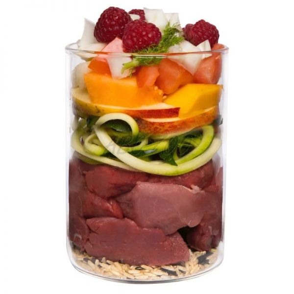 Arány Hús : rizs természetes : zöldségek/gyümölcsök/növények : egyéb összetevők = 60% : 7% : 31% : 2%