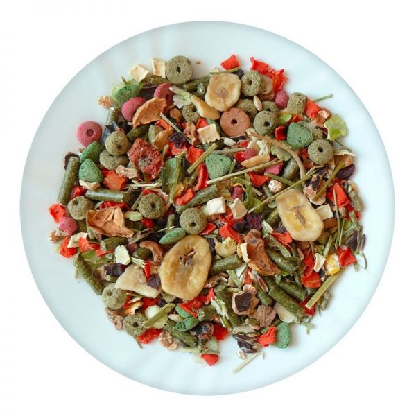 összetevők: lucerna, zöldségek (sárgarépa, cékla, paszternák, petrezselyem), extrudált búza, extrudált kukorica, borsópehely, gyümölcs (alma, banán), szentjánoskenyér, zab, búzapehely.