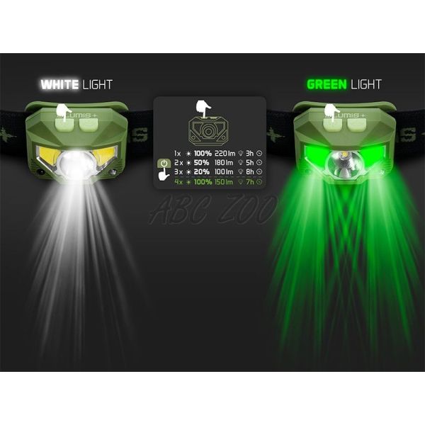 3 W teljesítményű, 220 lm fényerővel rendelkező fejlámpa, két LED-del, amelyek között válthat a hagyományos fehér és zöld fény között. Bővebb leírás