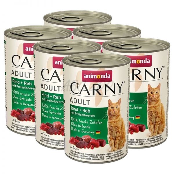CARNY ADULT konzerv marhahússal, őzhússal és tőzegávonyával - 6 x 400 g
