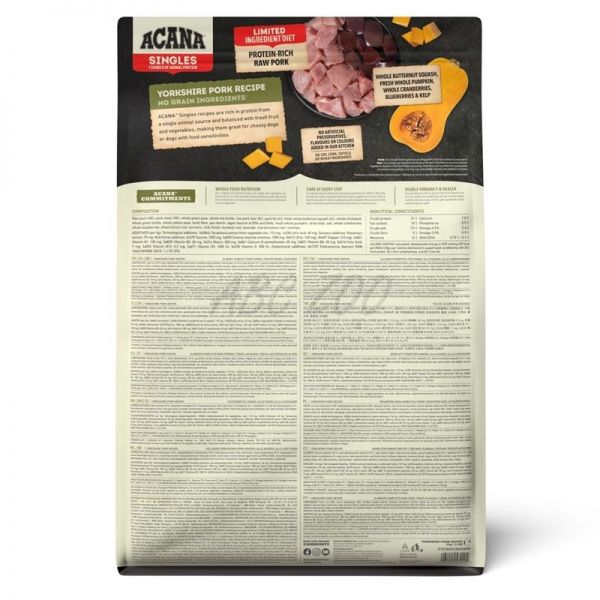 Összetevők: friss sertéshús 16%, dehidratált sertéshús 16%, egész zöldborsó, egész vöröslencse, sertésmáj 6%, sertészsír 6%, friss sertésvese 4%, friss egész pézsmatök 4%, egész csicseriborsó, egész zöldlencse, egész sárgaborsó, sertésízületek 2%, lencserost, tengeri alga 1,2% (DHA és EPA forrás), friss egész tök, szárított tengeri alga, fagyasztva szárított sertésmáj 0,1%, só, friss egész vörösáfonya, friss egész áfonya, cikóriagyökér, kurkuma, máriatövis, bojtorjángyökér, levendula, hibiszkuszgyökér, csipkebogyó