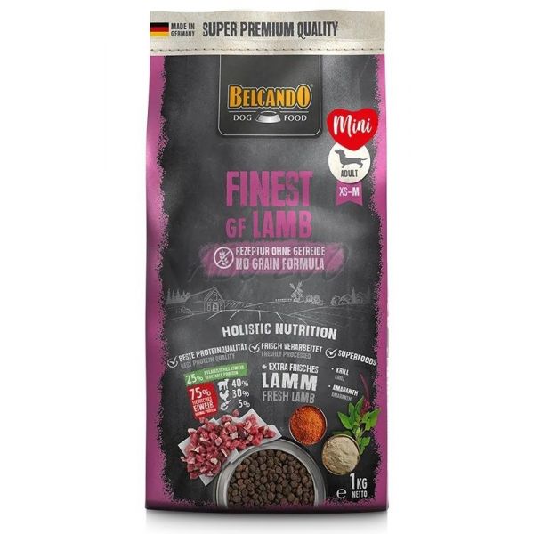 Összetevők: friss bárány 40 % (hús, máj, tüdő), amaránt 16,5 %, burgonyakeményítő, bárány fehérje 10 %, bárány fehérje alacsony hamutartalommal, borsóliszt, hidrolizált baromfimáj, őrölt krill 2,5 %, szárított sörélesztő 2,5 %, szőlőmag kivonat, szárított szentjánoskenyér, szárított cukorrépa cukor nélkül, chia mag, lazacolaj, nátrium-klorid, kálium-klorid, szárított gyógynövények 0,2 % (csalán levél, tárnicsgyökér, ezerjófű, kamilla, ánizs, kömény, fagyöngy, cickafark, szederlevél), Yucca schidigera