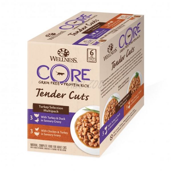 Wellness CORE Tender Cuts pulyka multipack természetes eledelből pulykával, kacsával és csirkehússal ízletes szószban, gabonafélék nélkül felnőtt macskák számára (1 éves kortól).