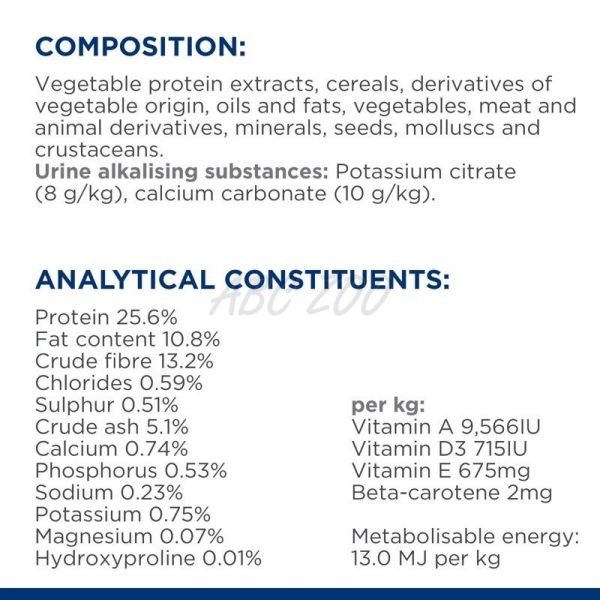 ÖSSZETÉTEL: Növényi fehérjekivonatok, gabonafélék, növényi eredetű származékok, olajok és zsírok, zöldségek, hús és állati eredetű származékok, ásványi anyagok, magvak, puhatestűek és rákfélék.Vizelet-savanyító anyagok: Dikalcium-foszfát, DL-metionin, kálium-klorid, dinátrium-foszfát, kolin-klorid.Fehérjeforrások: Kukoricaglutén-liszt, borsófehérje.