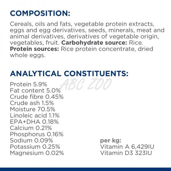 ÖSSZETÉTEL: Gabonafélék, olajok és zsírok, növényi fehérjekivonatok, tojás és tojásszármazékok, ásványi anyagok, magvak, hús és állati származékok, növényi eredetű származékok, zöldségek, gyümölcs. Szénhidrátforrások: Tört rizs, rizsliszt. Fehérjeforrások: Rizsfehérje-koncentrátum, szárított tojás.
