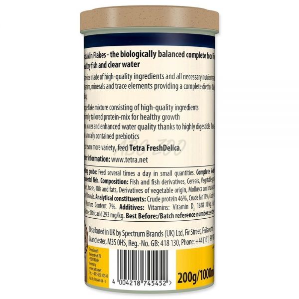 Minőségi elemzés: A-vitamin 37600 IU/ kg, D3-vitamin 2000 IU/ kg, E-vitamin 125 mg / kg, B1-vitamin 45 mg / kg, vitamín B2 125 mg / kg, B6-vitamin 25 mg / kg, B12-vitamin 0,1 mg / kg, L-aszkorbil-2-polifoszfát (stabilizált C-vitamin) 515 mg / kg, kalciu-pantotenát 125 mg / kg. További változatokban gyártják Tetra Min, Tetra Min mini és Tetra Min nagy pehely.