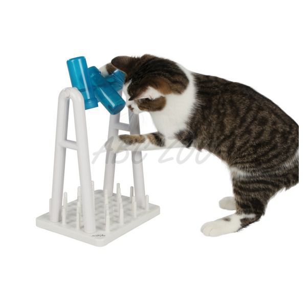 A játék egy fehér műanyag állványt tartalmaz két támasszal és három forgó elemmel. A jutalomfalat a forgó elembe van rejtve, amelyet a macska akkor kap meg, ha megforgatja. A játék a szórakozást és a játékot kombinálja, fejleszti az ügyességet, serkenti a pszichikumot. A kék csöveknek kétfajta fedele van az eleség kiesésének szabályozására. Az alsó részen található négy csúszásgátló talp megakadályozza a játékok csúszását.