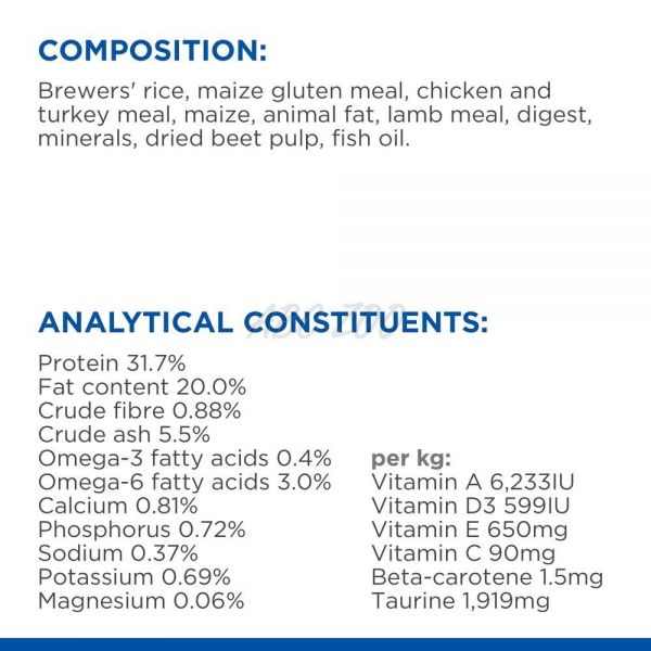 ÖSSZETEVŐK: Sörrizs, kukoricaglutén, csirke- és pulykaliszt, kukorica, állati zsír, bárányliszt, fehérje-hidrolizátum, ásványi anyagok, szárított répapép, halolaj.