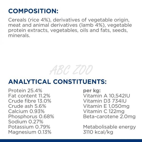 ÖSSZETÉTEL: Gabonafélék (rizs 4%), növényi eredetű származékok, hús és állati származékok (bárány 4%), növényi fehérjekivonatok, zöldségek, olajok és zsírok, magvak, ásványi anyagok.