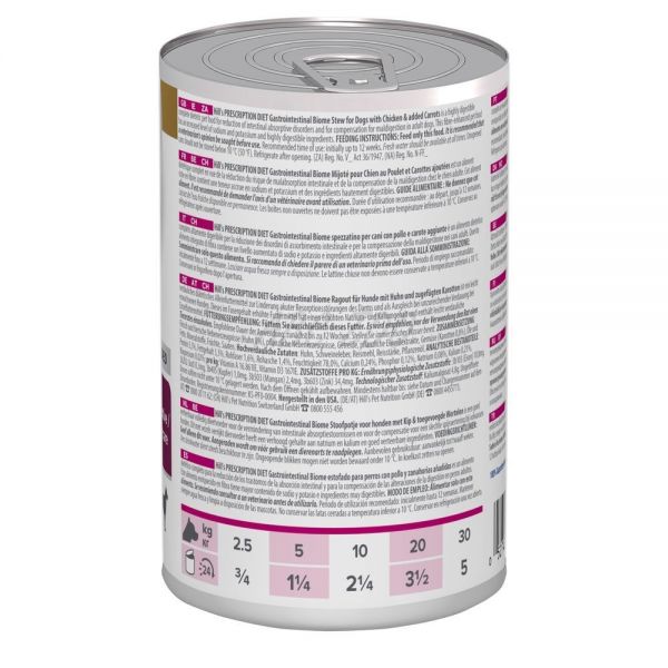 Hill's PRESCRIPTION DIET Gastrointestinal Biome Stew konzerv kutyaeledel csirkével és sárgarépával az emésztőrendszer ápolására.