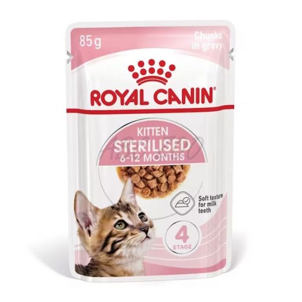 Sok gazda körülbelül 6 hónapos korában sterilizálja a macskákat. 48 órával a műtét után a macskája anyagcseréje lelassul – de valószínűleg éhes lesz, mint valaha! Mivel a sterilizált macskája aktivitási szintje továbbra is emelkedik, olyan táplálékra van szüksége, amely támogatja az egészséges növekedést anélkül, hogy felesleges hízást okozna. A ROYAL CANIN® Sterilized Kitten in Gravy kifejezetten úgy lett kifejlesztve, hogy támogassa a sterilizált kiskutyák táplálkozási igényeit a növekedésük „konszolidációs fázisában”. Ez a receptúra alkalmas a 6-12 hónapos sterilizált kiskutyák számára, mivel jelentős fizikai és viselkedési változásokon mennek keresztül. Ez a testreszabott táplálék nedves darabokat kínál szószban, amelyek optimális méretűek, textúrájúak és ízűek a növekvő kiskutyák számára. Emellett mérsékelt zsírtartalommal rendelkezik, amely segít csökkenteni a hízás kockázatát, miközben optimális fehérje-, kalcium- és foszfortartalmat biztosít az egészséges fejlődéshez. A receptúra olyan tápanyagokat is tartalmaz, mint a C- és E-vitamin, amelyek támogatják a kiskutyák egészséges immunrendszerének fejlődését. Ezek az antioxidánsok a táplálékban bizonyítottan serkentik a magasabb és gyorsabb antitesttermelést az oltás után. A ROYAL CANIN® Sterilized Kitten in Gravy a hasznos prebiotikumok (MOS) és a könnyen emészthető fehérjék kombinációjával segít fenntartani a bélmikrobiota (bélflóra) egészséges egyensúlyát a jó emésztés érdekében. A ROYAL CANIN® Sterilized Kitten in Gravy úgy lett megalkotva, hogy a legigényesebb macskák ízlését is kielégítse. Ez a nedves táplálék pozitív érzékszervi élményt nyújt a sterilizált macskájának, támogatja az egészséges hidratációt, és ideális a ROYAL CANIN® Kiskutya száraz táplálékával való kevert etetéshez. Tudta, hogy a kiskutyák táplálkozási igényei változnak, ahogy nőnek? Amikor a sterilizált macskája eléri a 12 hónapot, olyan étrendre lesz szüksége, amely kifejezetten az ő táplálkozási igényeikhez van igazítva, mint felnőtt macska.