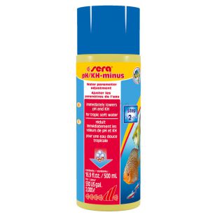 Először ellenőrizzék az akváriumi víz pH és karbonát keménységét. Megbízható eredményt a sera pH- Teszt és kH- Teszt segítségével nyernek. a) 7,0 pH érték felett és 6°dKH kH érték felett 5 ml sera pH-minus terméket adagoljanak 20 liter akvárium vízbe.