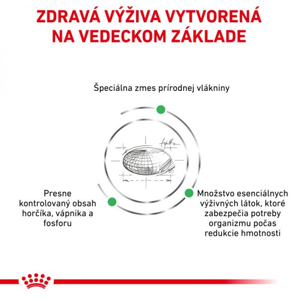 A túlzott táplálékbevitel és a kevés testmozgás túlsúlytól az elhízásig terjedő problémákhoz vezet. Az alacsony kalóriatartalmú, tökéletesen kiegyensúlyozott állatorvosi étrenddel azonban a kutya eléri az optimális testsúlyt és jó kondícióban marad.