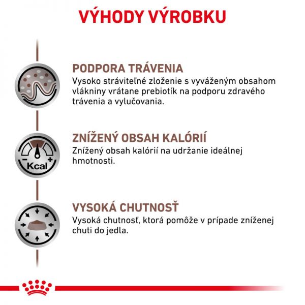 A Dog Gastrointestinal mérsékelt kalóriatartalmú termékcsaládot a gyomor-bélrendszeri rendellenességekkel küzdő és túlsúlyra hajlamos kutyák számára fejlesztették ki. Bővebb leírás